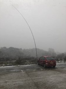 Windkracht 5 en sneeuwbuien vroegen het uiterste van de Spiderbeam. Als de wind nog verder was toegenomen had ik de mast een stuk moeten laten zakken of tuidraden bevestigen. Het ging gelukkig goed ik kon een paar mooie contacten scoren.
